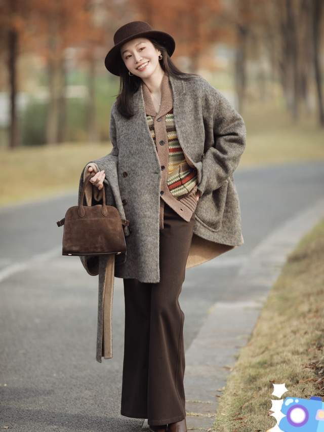 我们应该选择经典纯色的手提包,用棕色皮包搭配棕咖色的大衣,内搭同色系的针织毛衣和一条格纹的西装裤,就显得很有气场。