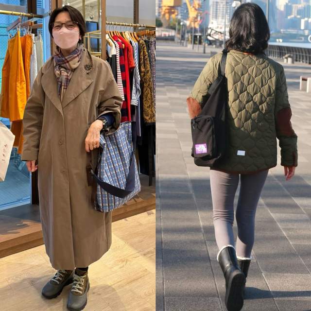 其实有一个不是很成立的理论,上面这位时尚达人手里提的体积比较大的皮包,瞬间整个人感觉有点臃肿,最主要的原因是她穿了自带蓬松感的羽绒服。