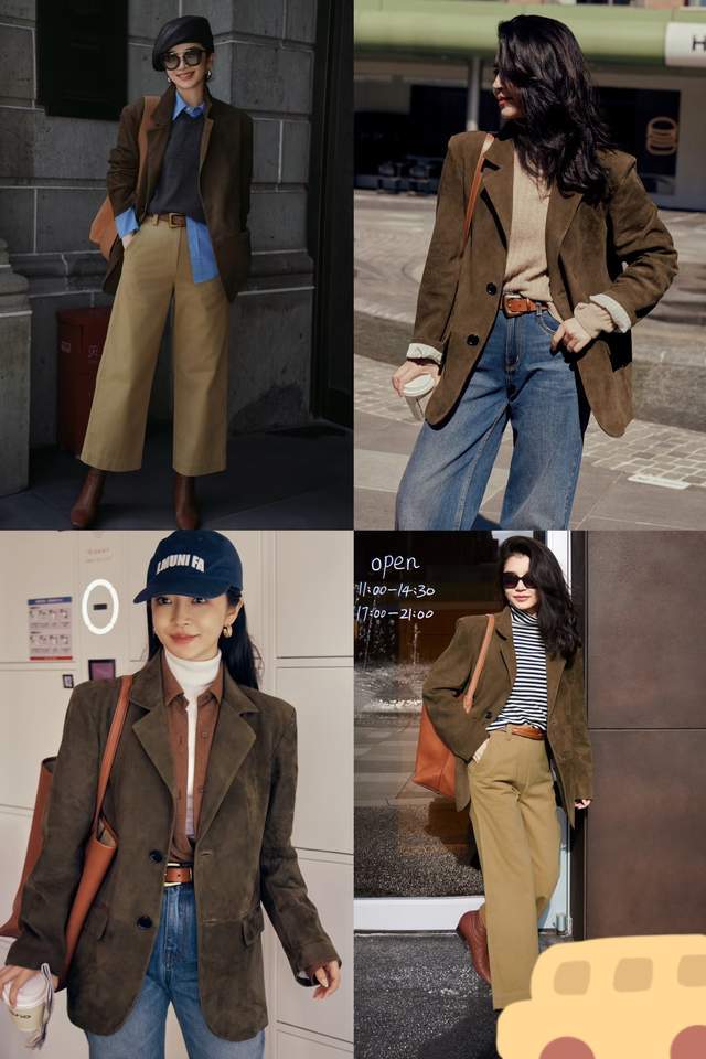 比如,上图三木时尚博主,用燕麦色西服内搭针织毛衣,叠穿牛仔衬衫和一条卡其色的九分裤,脚穿棕色短靴,手里提的是比较有质感的棕色和白色拼接的小方包,和整体造型的干练气质很搭,这就形成了一个加分项。