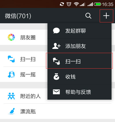打开微信,在右上角+号功能选项中选择 扫一扫
