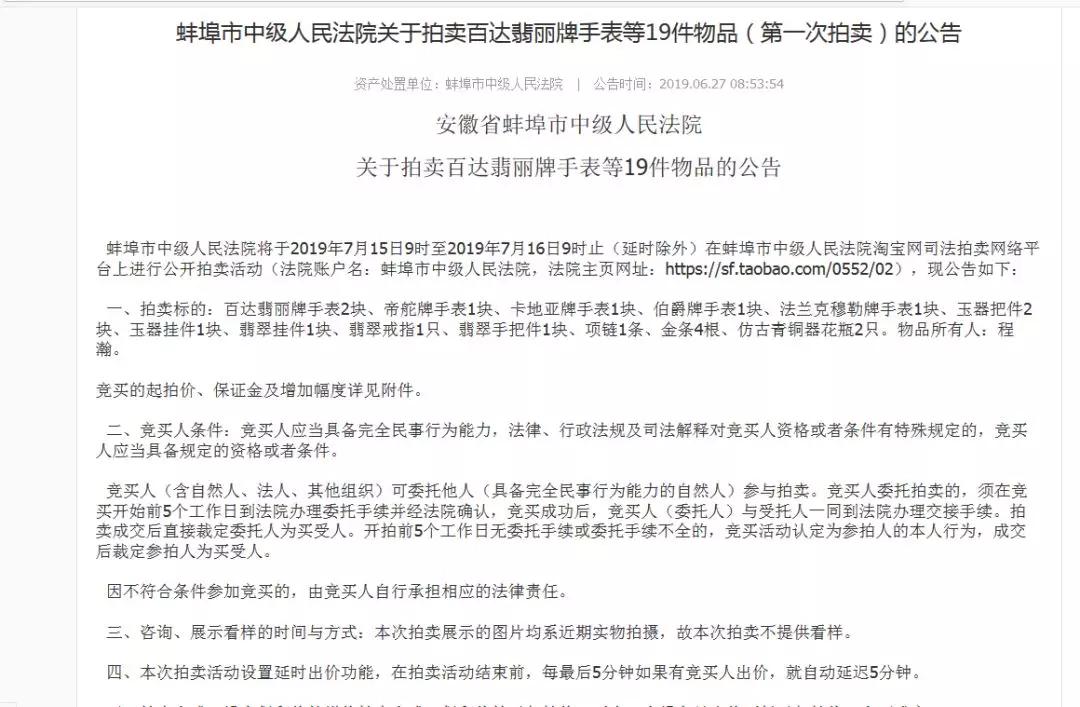 公告中称:拍卖标的包括百达翡丽牌手表2块、帝舵牌手表1块、卡地亚牌手表1块、伯爵牌手表1块、法兰克穆勒牌手表1块、玉器把件2块、玉器挂件1块、翡翠挂件1块、翡翠戒指1只、翡翠手把件1块、项链1条、金条4根、仿古青铜器花瓶2只。物品所有人:程瀚。